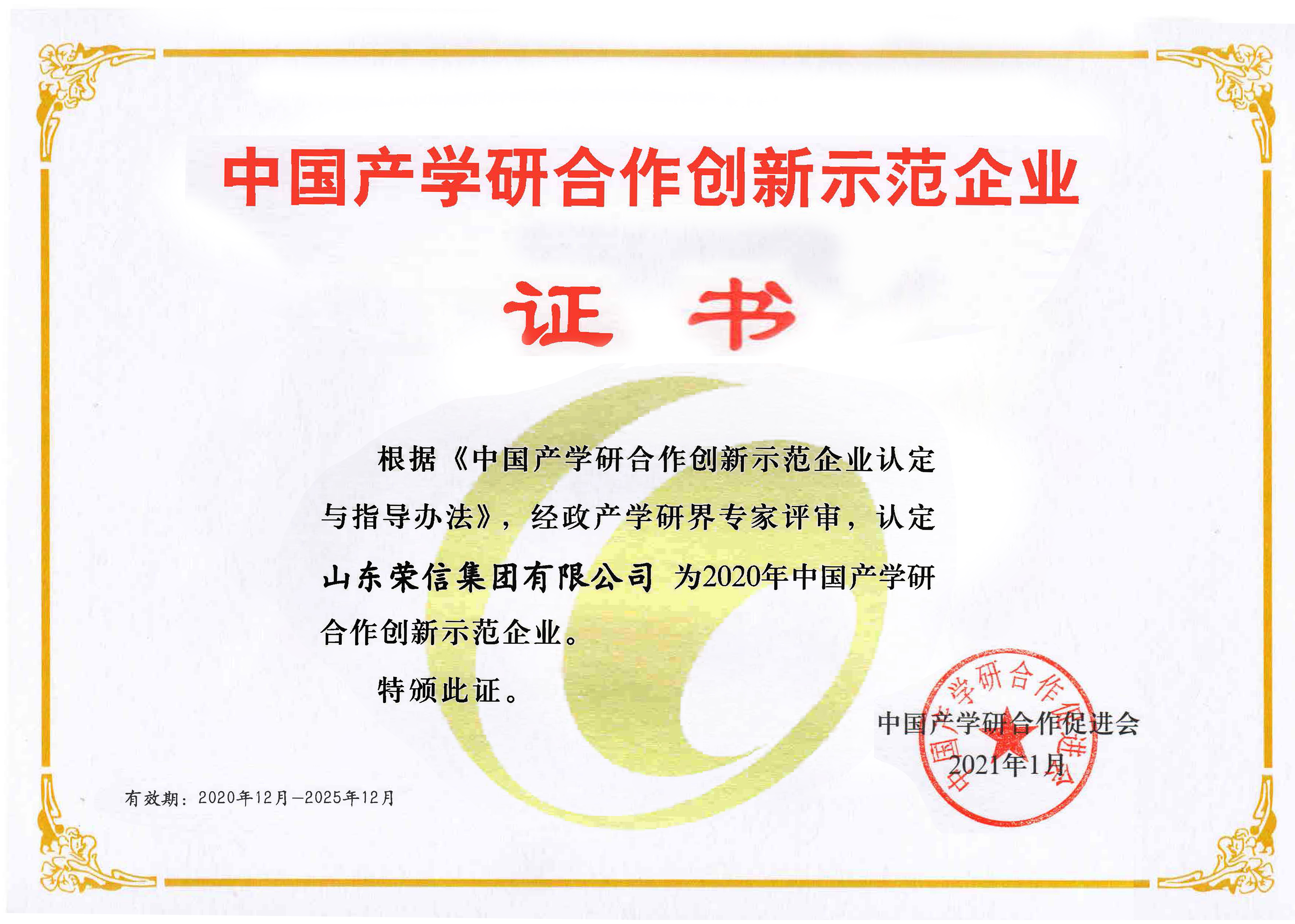 2021年中國產學研合作創新示范企業-榮信集團證書
