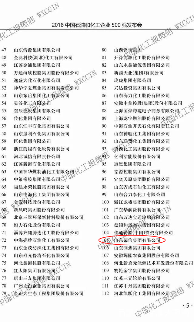 8月22日,由中國石油和化學工業聯合會和中國化工企業管理協會主辦的“2018中國石油和化工企業500強發布會暨創新與引領——中國石油和化工大企業高峰論壇”在上海召開。石油和化學工業規劃院、北京化工大學經濟管理學院及數百家企業和機構的代表共計400余人與會,共同見證了賦有“中國石油和化工福布斯榜”之稱的“中國石油和化工企業500強排行榜”的揭曉。其中山東榮信集團有限公司強勢上榜,排名第105位。
