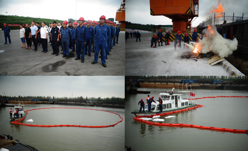 活動(dòng)分為港口岸上火災(zāi)消防演練以及水域環(huán)境污染緊急處置兩部分進(jìn)行。岸上消防演練首先模擬了停靠船舶意外發(fā)生火災(zāi),按照預(yù)案部署,應(yīng)急救援小組立即開展滅火救援工作。事故救援組深入火災(zāi)現(xiàn)場全面搜救被困人員,搶險(xiǎn)組合理設(shè)置滅火陣地,控制火勢蔓延,最后將火情撲滅。水域環(huán)境污染演練模擬了物流中心裝船作業(yè)船只在港區(qū)靠泊作業(yè)期間,意外跑冒黑色污染物,現(xiàn)場員工發(fā)現(xiàn)后立刻向現(xiàn)場指揮部報(bào)告。指揮部接報(bào)后,在命令意外泄污船只先自行控制污染源的同時(shí),立即啟動(dòng)物流中心船舶作業(yè)活動(dòng)污染水域應(yīng)急預(yù)案,調(diào)遣應(yīng)急小組前往清污,并向濟(jì)寧市港航局鄒西航管處匯報(bào)。應(yīng)急小組拖掛圍油纜到達(dá)現(xiàn)場后,分別拖住圍油纜的一頭靠近不斷擴(kuò)散的污染物,從兩邊包抄將污染物團(tuán)團(tuán)包圍起來。另有一方面配合海事船只圍油纜船,防止污染擴(kuò)散。此外,應(yīng)急人員在統(tǒng)一指揮下向河中拋撒吸油氈,清理遺留在圍油纜外的零星污染。待污染物被圍油纜徹底圍攏后,清污隊(duì)員立刻對污染物進(jìn)行回收。約半小時(shí)后,污染物被全部清除。