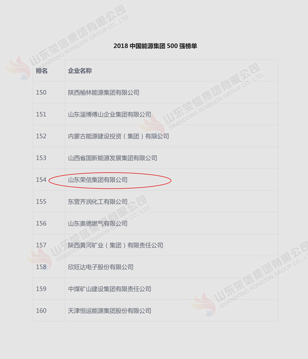 近日,“2018中國能源集團500強”榜單發布,山東榮信集團有限公司榜上有名,位列第154名,比去年上升14位。