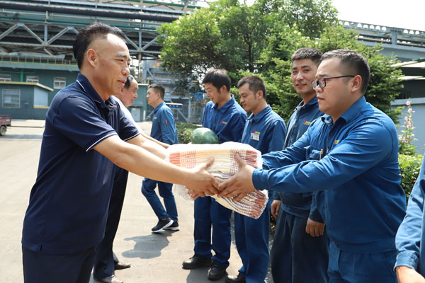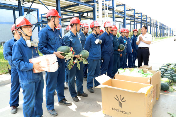 活動中,公司相關領導詳細詢問了防暑降溫工作情況,叮囑大家要提高自我保護意識,采取有效措施,預防中暑突發事件發生。并將茶葉、毛巾、西瓜、雪糕等慰問品親自發放到他們手中,溫暖著每一名職工的心,為高溫下恪盡職守的廣大職工增添了絲絲清涼,極大地調動了大家的工作積極性。