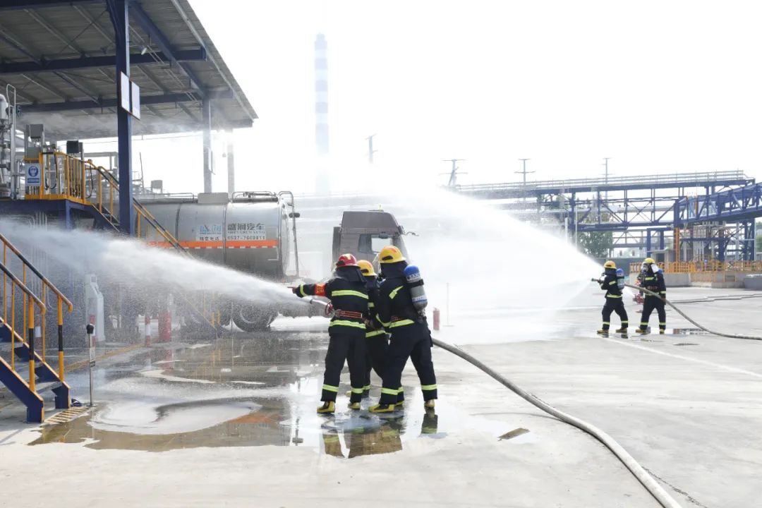 此次演練模擬情景設置為危險化學品酚油裝車泄漏著火。隨著總指揮一聲令下,公司立即啟動危險化學品泄漏應急救援預案,救援工作環環相扣,分工明確,有序開展。應急處置組首先對裝車閥前管道泄漏的酚油進行圍堵,動用現場資源及相關救援設備,開展現場救援工作;后勤保障組負責疏散其他無關人員,第一時間清點人數;滅火戰斗組及時撲滅初期火災,向現場指揮報告情況;搶險搶修組攜帶防爆工具和堵漏卡具對酚油泄漏點進行現場搶修。在各應急小組的密切配合下,危險化學品酚油裝車泄漏著火事故被成功處置,險情解除。